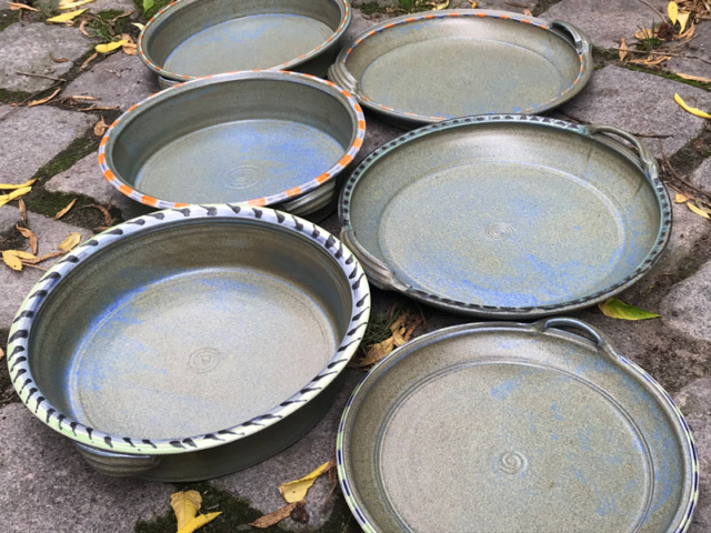 Ich fertige Geschirr in kleinen Serien aus Steinzeug für den täglichen Gebrauch an. Es wird zum größten Teil frei auf der Töpferscheibe gedreht. Die Gestaltung der Formen sind schlicht und doch individuell. Das Sortiment ist so angelegt, dass man die Muster kombinieren und zusammenstellen kann. Farben und Dekore sind zeitlos.